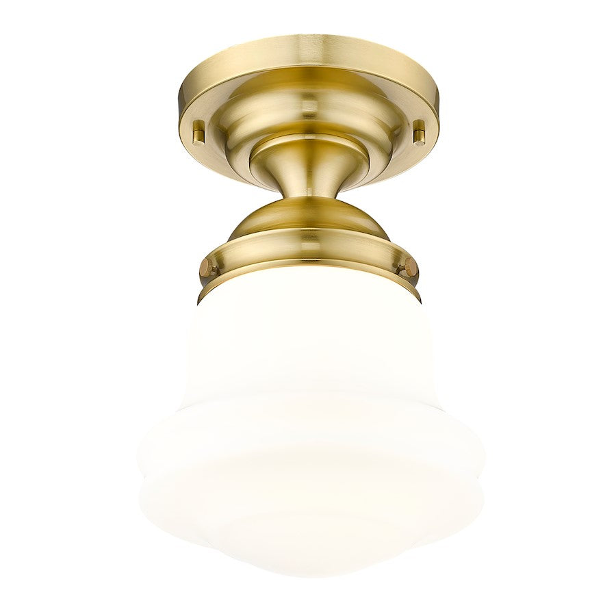 Upgrade home lighting with a modern one-light flush mount ceiling light with vintage inspirations. Borrowing from Mid-Century motifs, it boasts matte opal schoolhouse glass to complement a decorative mounting in a rich luxe gold finish. Perfect for a walk-in closet, powder, room, bedroom, and beyond.