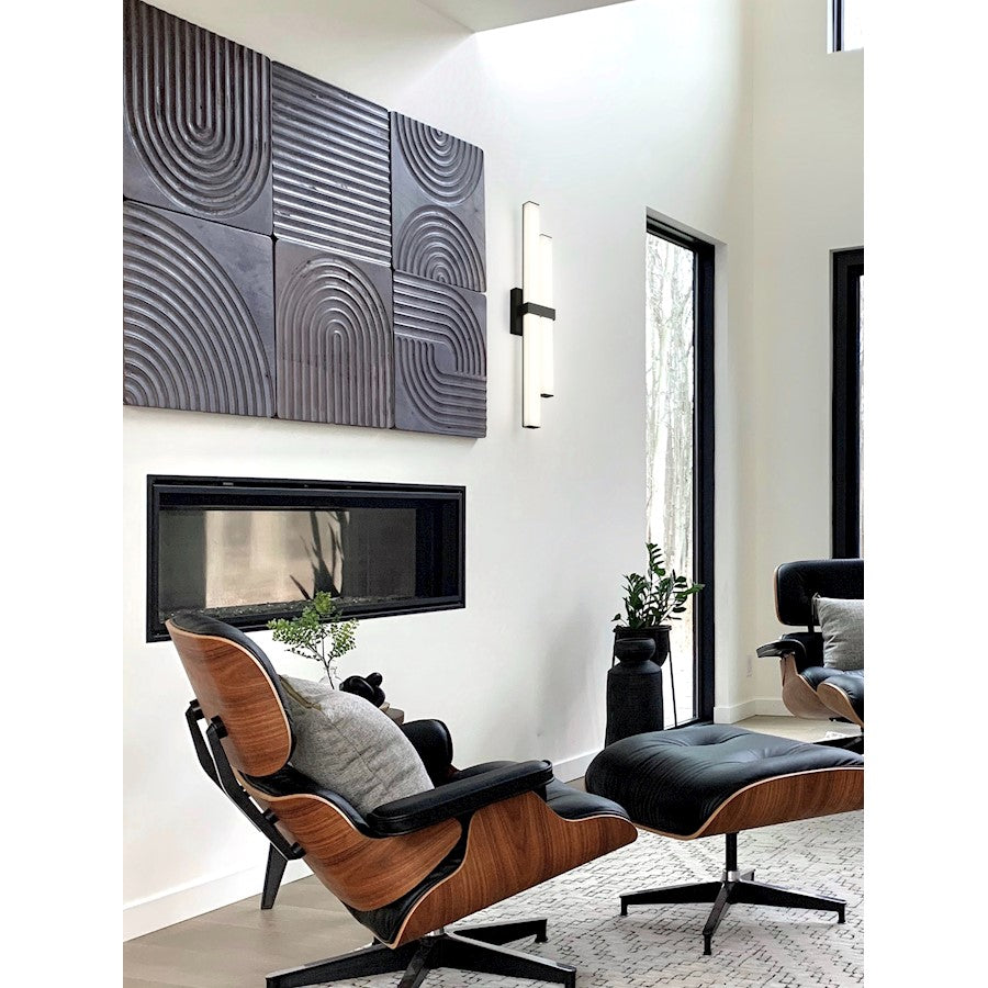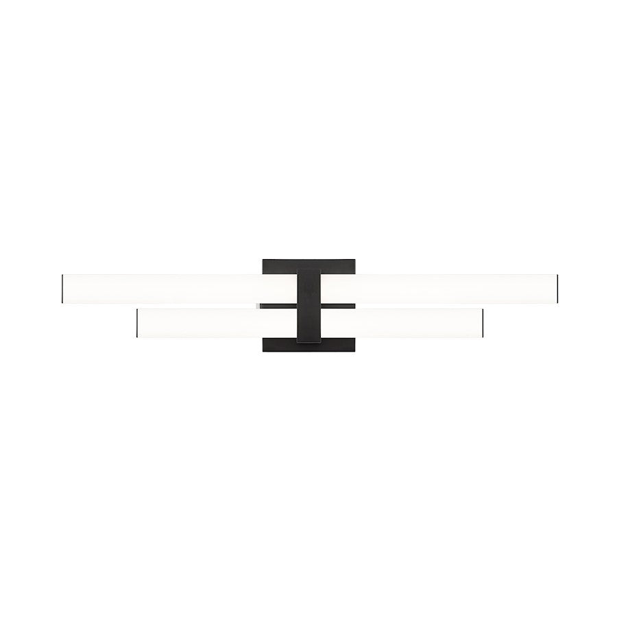 The design power of contrast plays a key role in this updated two-light vanity light. Aluminum framing and accents offer a dynamic matte black finish, as graduated frosted bar diffusers align vertically to emit dimmable LED lighting with a customized option of white color values.