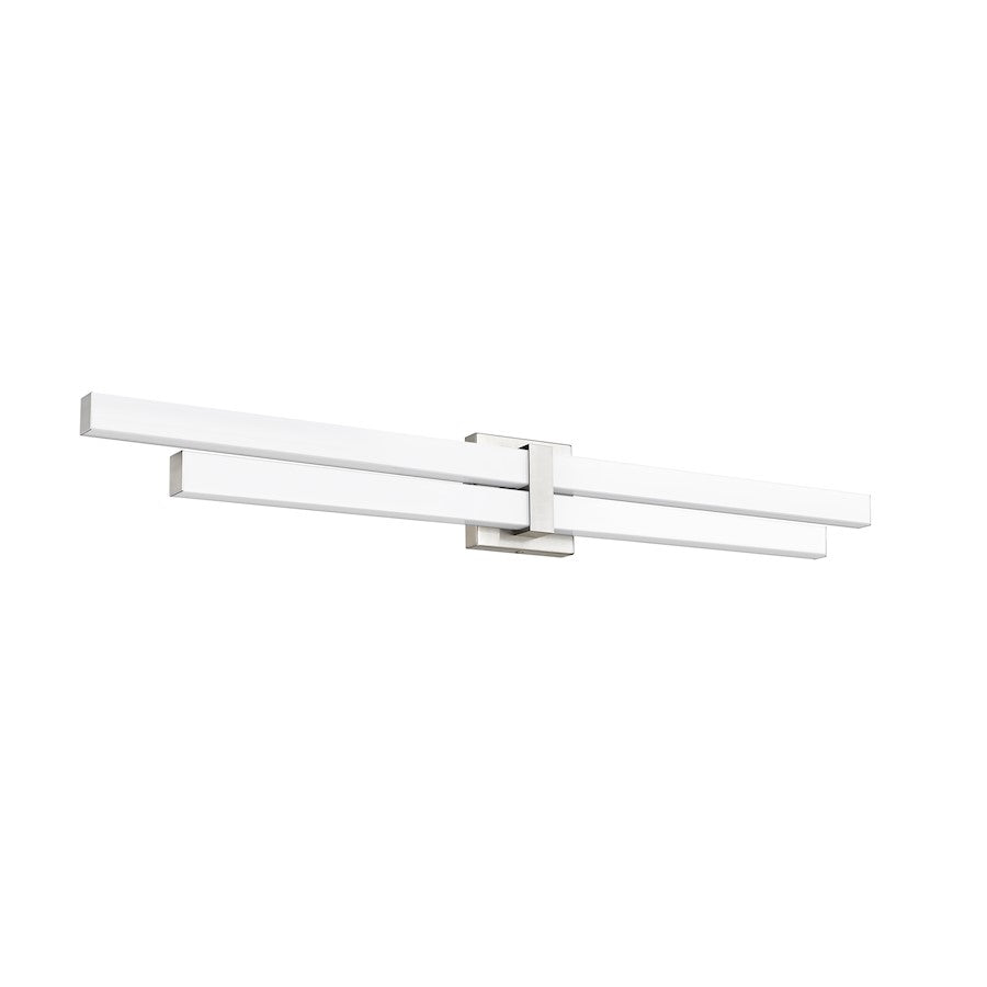 Light up a contemporary bath space with a dynamic structural vibe that makes a difference, choosing this two-light vanity light for function and aesthetics. Aluminum framing and accents offer a sleek brushed nickel finish, as graduated frosted bar diffusers align vertically to emit dimmable LED lighting with a customized option of white color values.