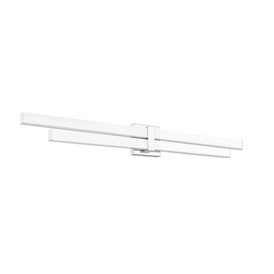 Designed for modern bath spaces, this two-light vanity light delivers a striking structural silhouette and an energetic vibe. Aluminum framing and accents offer a clean chrome finish, as graduated frosted bar diffusers align vertically to emit dimmable LED lighting with a customized option of white color values.